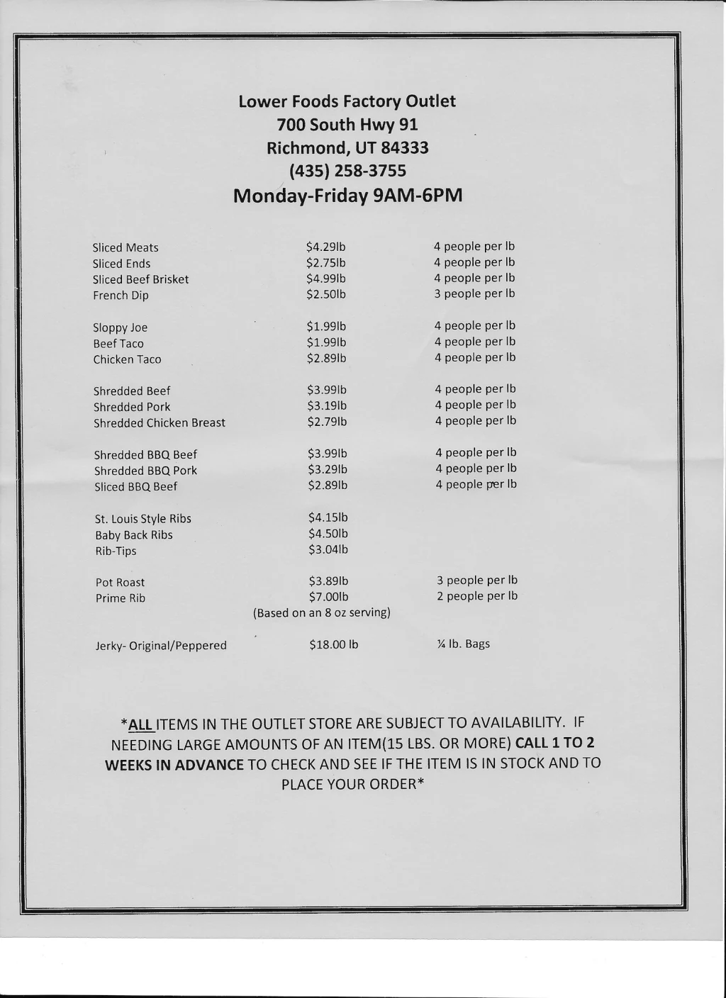 Lower Foods Factory Outlet, 700 South Hwy 91, Richmond, Ut 84333…..Give them a call…435-258-3755! Open Monday through Friday 9 till 6!
