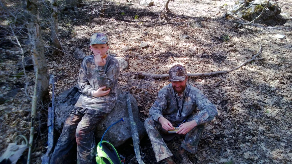 And of course it isn’t turkey hunting without a little walk in the woods, calling and looking. We made the 2 mile hike to the snow line and sure enough, there was a big bird…..PUTTING and walking away from us! Busted Big Time once again. Dang!