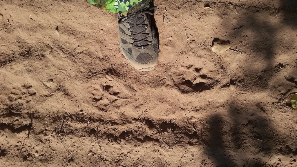 Looking down I saw some fresh tracks in the dust around a fire pit and held him back from his pulling long enough to study the prints left in the dirt.