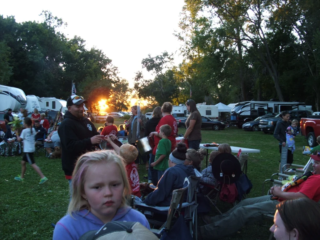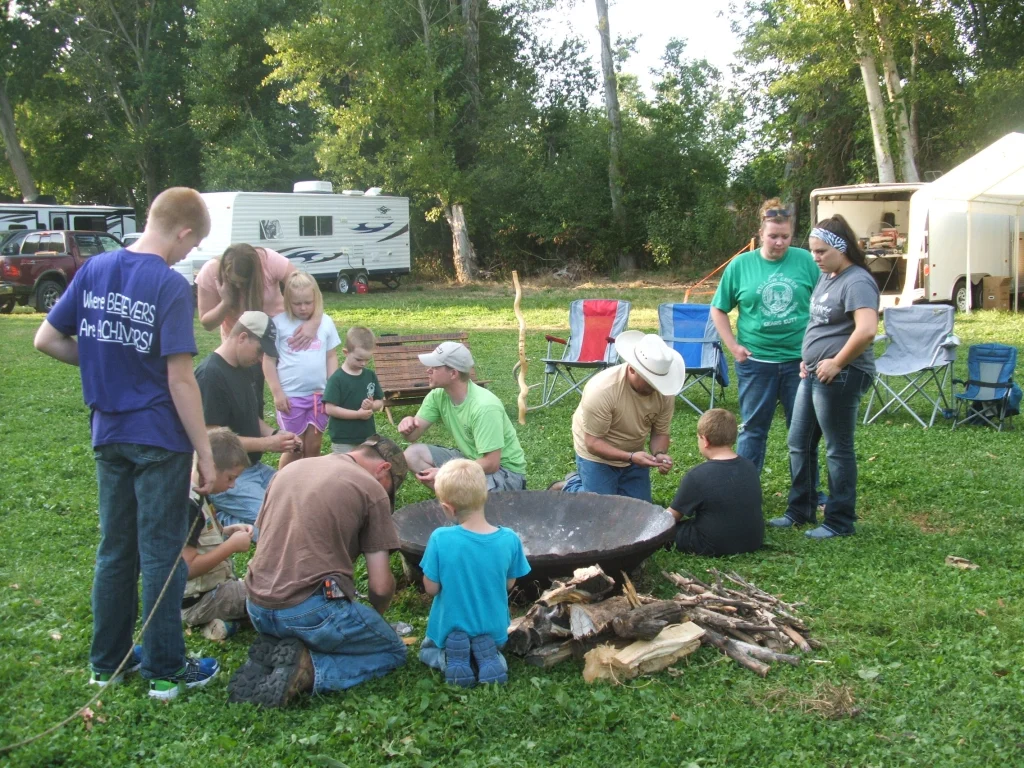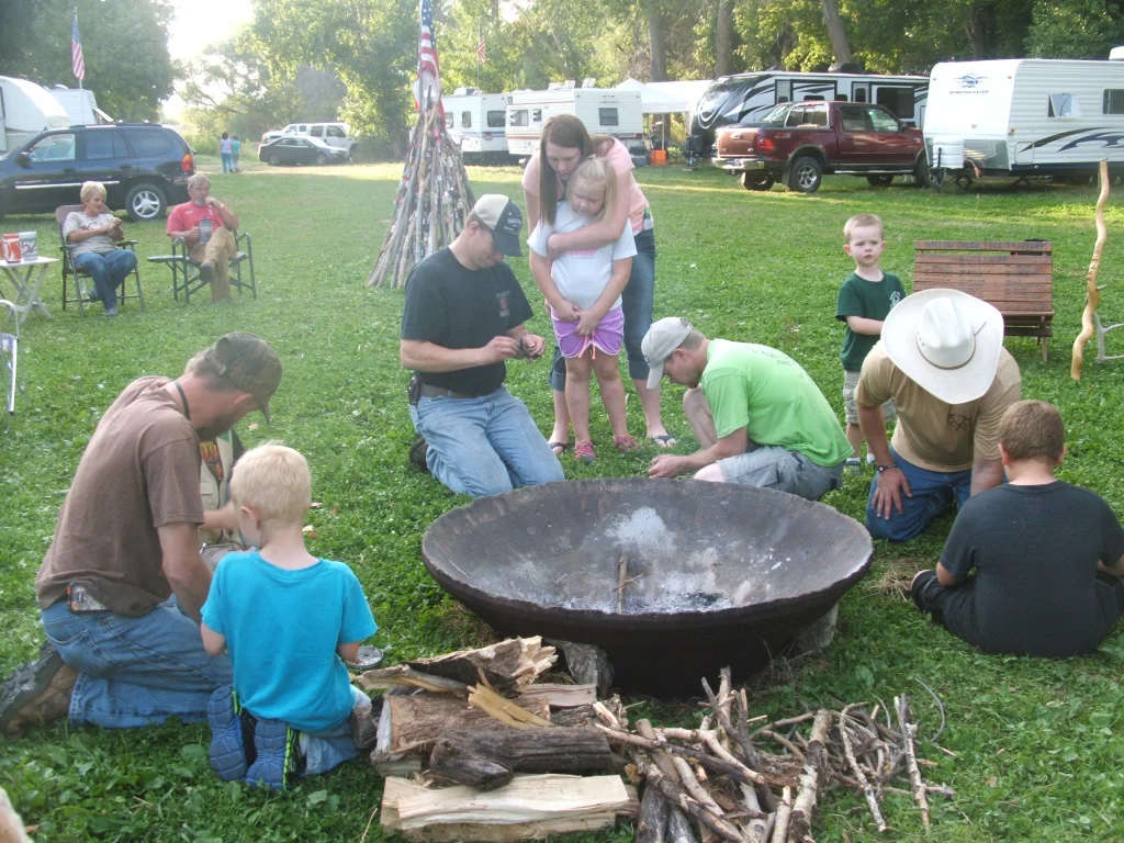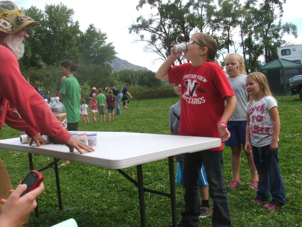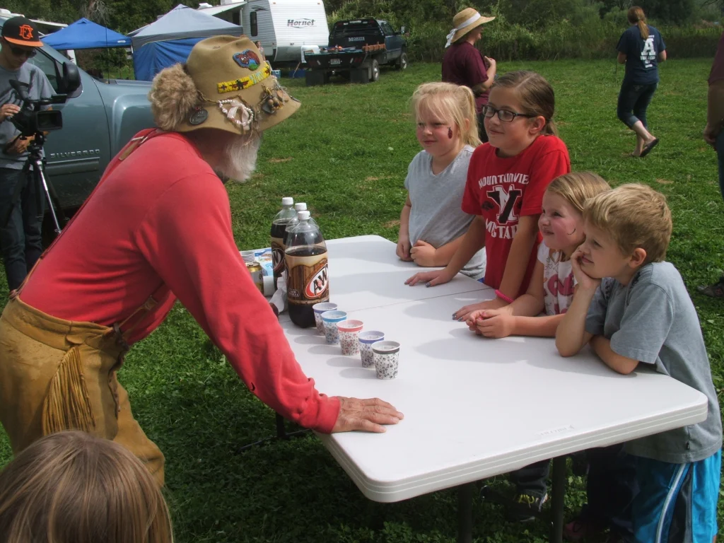 Well, we did have an organized event for the kids all lined up…the “Young Peoples Lympics”!  These kids were broken up into teams of 4 to 5 and each team had to toss a frying pan for accuracy, start a fire and burn a string, drink up some root beer and a few other things.  The team with the fasted time to do all these things won a great prize for each team member.  Yours truly, Bears Butt, was set up to be the bar tender and dish out the root beer.