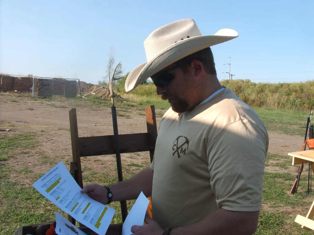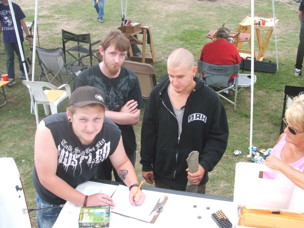 Just to clarify some things.  Here we have three guys signing up to compete in the shooting.  Not only do they sign up, they also sign a waiver of liability and they present to the Range Master their blanket prize.  Remember I said “everyone wins”, well every shooter brings to the table a gift, either hand crafted or purchased, that is worth around $20 and it must be in good “mixed company and mixed age” taste.  No competitive shooting without the prize.  This keeps everything above board and everyone is happy in the end.