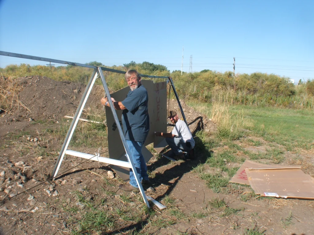 The “A” frame and cross member range is made of angle iron and the cardboard is attached using wire ties at the top and then again onto a cable run along the bottom.  If we could find another medium to attach out targets to it sure would be a nice improvement, as when the wind blows it doesn’t take a lot of wind to knock the stand down.  We make do with what we have.  The range was set up on Wednesday afternoon and the cardboard was attached early on Thursday, just in time for the first day of shooting to take place.  Some folks have other obligations and must complete their shooting before the Saturday Noon deadline.  So basically we have 2 and 1/2 days of shooting.  The range must be manned/womanned with range masters covering both ends of the shooting line.  For future events, two range master should be employed, one on either end of the shooting line for improved safety.  Not that we had any real issues this year, just because we could use the extra safety.