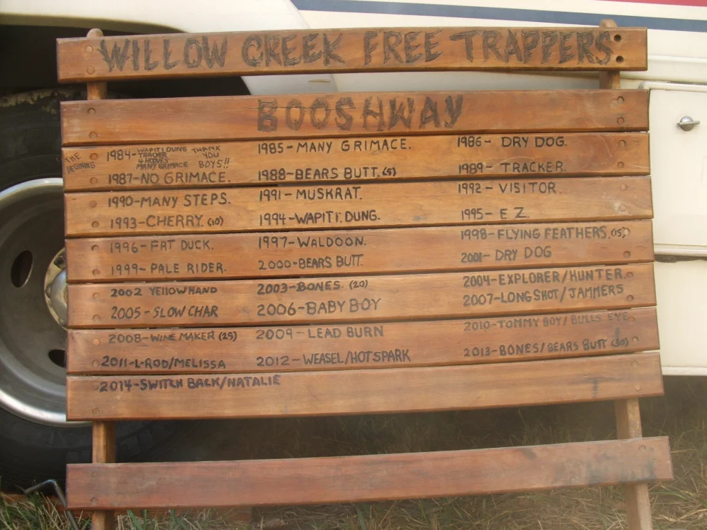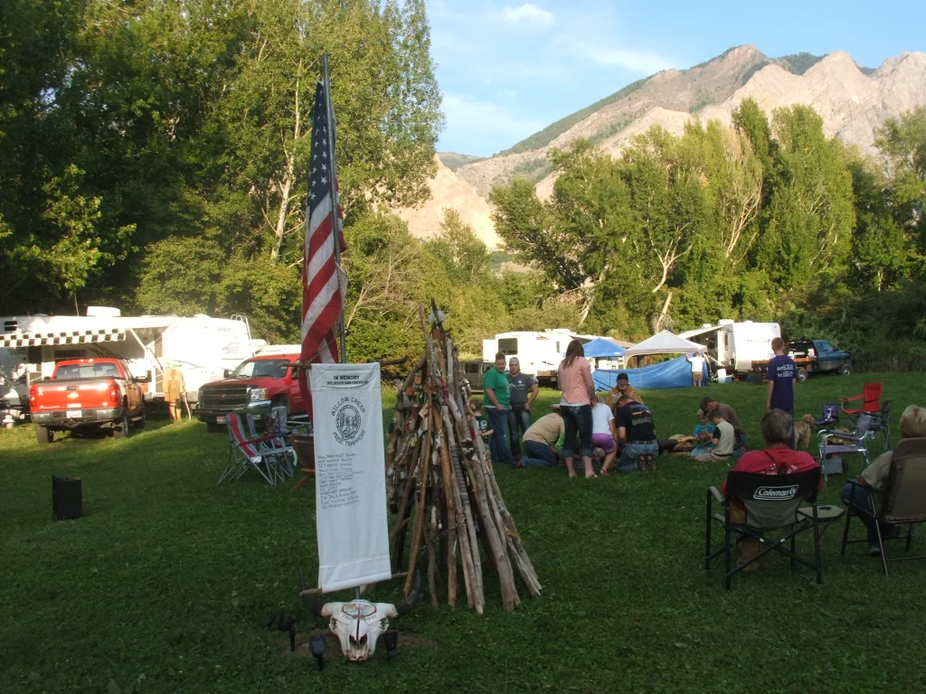 Our American Flag stands tall, our list of Willow Creek Free Trappers who have gone on ahead of us, waves proudly in the breeze.  Our Beaver Sharn stand protects the camp from evil doings and bids us good luck on all the events of the camp.